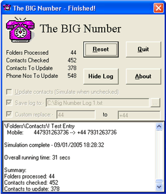 A number of UK area codes changed on April 22nd, 2000. This utility was designed to automatically update phone numbers held in Microsoft Outlook Contacts. It is compatible with all versions of Outlook up to & including Outlook 2007. The program incorporates all the area code changes for the UK Mainland & Northern Ireland and all changes to Pagers & Mobiles as detailed by British Telecom and NumberChange. In all over 80 code changes are catered for. In a typical run, The BIG Number took less than 1 minute to check a 1000 records, identifying 1200 numbers that needed correcting. If you were thinking of updating contacts by hand, think again....