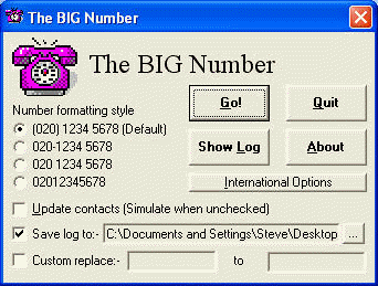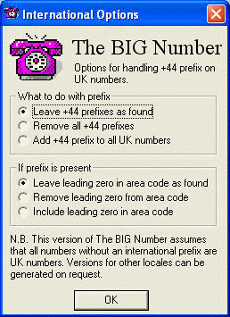 The BIG Number updates all contacts that are stored in designated "Contacts" folders within an Outlook profile, whether stored in local personal folders (*.pst files) or on an Exchange Server. If you've more than one profile, simply open each one in turn and run the program. As well as implementing all the "Big Number" dialling code changes, The BIG Number includes a range of options to set the format of phone numbers to suit a variety of national and international conventions.