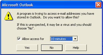Recent versions of Outlook incorporate an access control feature to prevent viruses from harvesting email addresses. In order for The BIG Number to process your contacts you will need to grant permission when this dialog appears:-